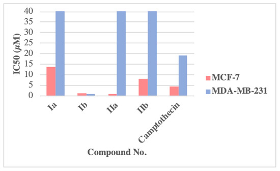 The biological investigation started with the evaluation of the cytotoxic activity of the intermediates Ia–b and IIa–b (Table 1). Compounds Ib and IIa had a highly cytotoxic effect against the MCF-7 cell line, with IC50 values of 1.44 and 1.00 μM, respectively. However, only compound Ib was highly cytotoxic to the MDA-MB-231 cell line, with its IC50 value of 1.00 μM being about 19 times more potent than the reference standard camptothecin (IC50 value of 19.24 μM, Table 1 and Figure 2). Methyl (7-methoxy-2-oxo-2H-chromen-4-yl)acetate (Ib) was highly cytotoxic towards both breast cancer cell lines.
