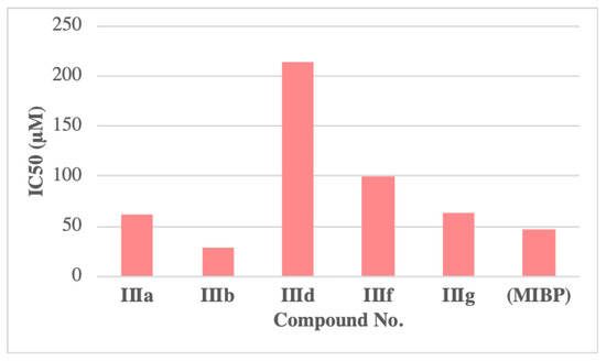 The in vitro antiestrogenic activity of the selected target compounds IIIa,b, IIId, and IIIf,g was studied through an estrogen-dependent human breast cancer MCF-7 cell proliferation assay in the presence of 17-β-estradiol. The ability of the tested compounds to inhibit cell proliferation induced by 17-β-estradiol was determined (Table 3 and Figure 4). One of the disadvantages of the compound SP500263 was that it had an undesirable agonist activity in the MCF-7 proliferation assay. However, among the synthesized compounds, compound IIIb is the most active, with its IC50 value of 29.49 μM being about twice as potent as the reference compound, MIBP.