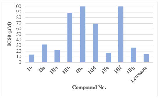 Moreover, acetamides IIIa–g showed low or no aromatase inhibition activity (Table 4 and Figure 5), except compound IIIe, which showed moderate inhibitory activity against aromatase (IC50 = 17.38 μM), alongside its promising activity towards the MDA-MB-231 human breast cancer cell line (IC50 value of 2.14 μM).