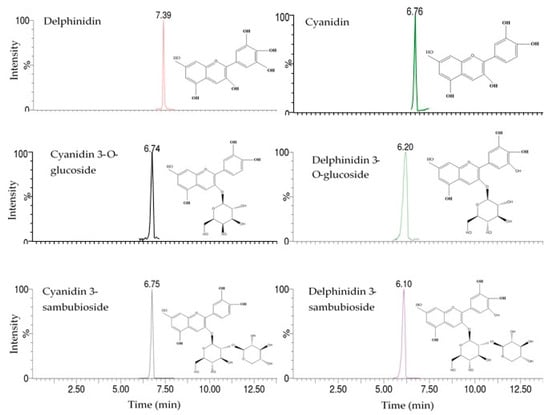 Electrospray ionization (ESI) was used. [M]− is given as the identity of the molecular ion instead of [M + H]− because, in acidic conditions, there are anthocyanins, such as flavylium cations [35], with a collision energy of 10 V. The electrospray capillary voltage was 1.5 kV, the source temperature was 150 °C, the desolvation temperature was 350 °C, the gas (nitrogen) was provided at a flow rate of 500 L h−1, the cone voltage was 40 V, and the collision gas was 20 V. The compounds were identified based on the literature [22] and quantified based on curves of HPLC-grade analytical standards of cyanidin 3-O-glucoside (CAS No. 7084-24-4) and delphinidin (CAS No. 528-53-0), with a degree of purity ≥95% for both (Sigma-Aldrich, USA). On the basis of this methodology, the analysis method is considered reliable.