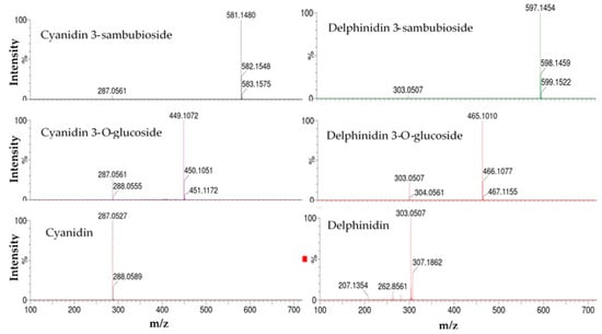 Mass spectra with a collision energy of 10 V for the identification of anthocyanins and anthocyanidins.