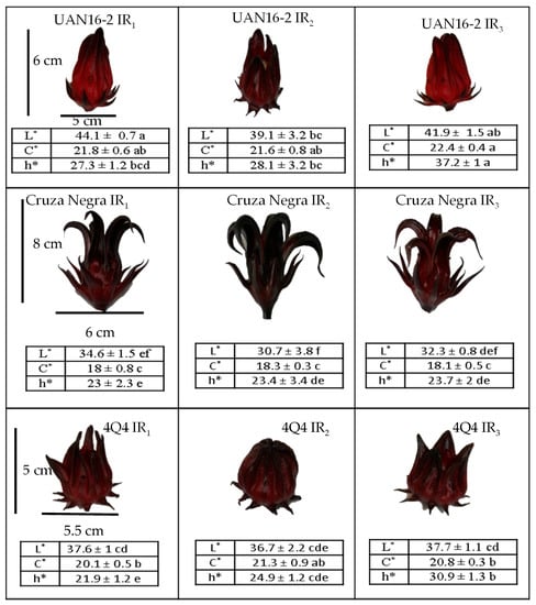 Color parameters and calyx appearance of different roselle genotypes in three irrigation regimes (IR1 = 100%, IR2 = 65%, and IR3 = 33% humidity). Means with different letters within columns and rows per response variable show significant differences according to the Tukey test (p ≤ 0.05).