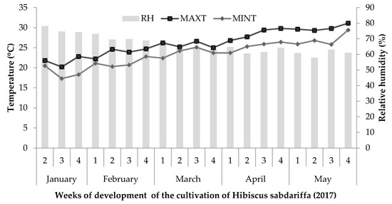 Weekly average of relative humidity (RH) and maximum (MAXT) and minimum temperatures (MINT) during the cultivation of roselle.
