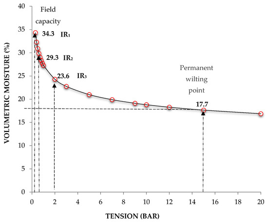 A two-factor completely randomized design was used, with three levels per factor: factor 1, cultivar (Cruza Negra, UAN16-2 and 4Q4); and factor 2, substrate moisture level (100%, 65%, and 33%). There were three treatments in total, with each unit represented by five plants (one of which was used to monitor substrate moisture) and three experimental replicates per treatment; in addition, there were 56 board plants. To obtain the moisture retention curve of the soil mixture, three samples were taken, pre-saturated, and then subjected to different stresses by the pressure membrane method, applying the principle of hydrostatic equilibrium [30]. Then, on the basis of the curve, three irrigation regimes (IR) were selected: 100% (343 mL L−1 soil mixture) humidity at field capacity (FC) (IR1: irrigation regime without deficit in available soil moisture for the plant), 65% of the FC moisture required (293 mL L−1) (IR2: irrigation regime with moderate soil moisture deficit), and 33% of the FC required (236 mL L−1) (IR3: irrigation level with high soil moisture deficit), all with a moisture range of ± 5% (Figure 5).