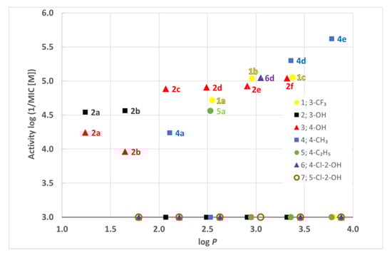 Plot of antimycobacterial activity against Mtb H37Ra expressed as log (1/MIC [M]) and calculated lipophilicity logP. Inactive compounds had an arbitrary value of activity of 3.0.