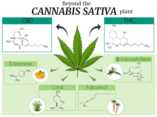 Beyond the Cannabis sativa plant. The Era of cannabinoids started with the description and isolation of the main Cannabis sativa psychoactive component, Δ9-tetrahydrocannabinol (THC). However, many other natural compounds were also identified, totalizing 565 substances among cannabinoids and non-cannabinoids constituents. This figure illustrates some of the Cannabis sativa compounds (d-limonene, β-caryophyllene, citral, and falcarinol) and its molecular structures that can be also found in other plants, such as Cordia verbenacea, lemon, Cymbopogon citratus, and carrot. CBD, cannabidiol. Figure created using the Mind the Graph platform.