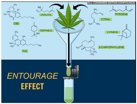 We just established that phytocannabinoids demonstrate different pharmacological effects, and it can get even more intriguing and complex when we focus on previous data describing that the combined use of some phytocannabinoids can possibly increase the positive effects proportionate by them. For instance, the use of CBD associated with ∆9-THC promoted downregulation of the neuroinflammatory process in animal models of multiple sclerosis (MS) [75], besides, reducing pain [76] and muscle spasticity in MS patients [75]. Importantly, CBD attenuated the psychotropic effects of THC when used in a combined form [75]. This last piece of data supports the hypothesis that CBD binds to an allosteric site on CB1R that is functionally distinct from the active site for 2-AG and THC [77]. In this same context, a recent study reported that a botanical drug preparation (BDP) was more potent than pure THC to produce antitumor responses in cell culture and animal models of breast cancer. While pure THC mainly activated CB2R and generated reactive oxygen species (ROS), the BDP modulated different targets and mechanisms of action [78]. This combined effect, observed with the association of phytocannabinoids and other compounds present in the Cannabis sativa plant, such as terpenoids, is known as the entourage effect [79] (Figure 2).