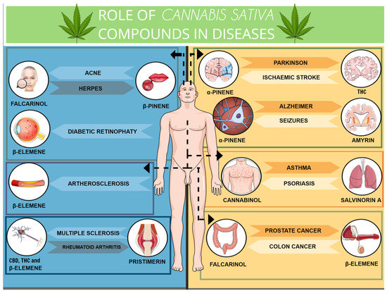 Role of Cannabis sativa compounds in diseases. The Cannabis sativa compounds have been proved useful for treatment of different diseases in the periphery and the CNS, as illustrated above. The CBD and THC actions in the CNS include immunomodulatory, neuroprotective, anxiolytic, and anticonvulsant, in addition to its potential effects on PD and multiple sclerosis control. Anticancer effects can be attributed to almost all Cannabis sativa compounds. This figure further illustrates the effect of terpenoids, cannabimimetic ligands, beyond the Cannabis plant in different pathological conditions, such as Herpes infection, diabetic retinopathy, psoriasis, asthma, AD, seizures, ischemic stroke, and others. Figure created using the Mind the Graph platform.