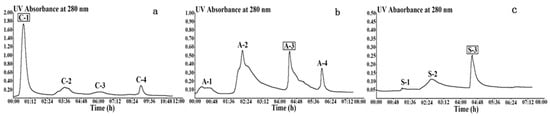 Figure 1. Chromatography of purification of endo-1,4-β-xylanase. (a) SP-Sepharose Fast Flow cation exchange chromatography. (b) Q-Sepharose Fast Flow anion-exchange chromatography. (c) Source 30Q anion-exchange chromatography. The ordinate of (ac) is absorbance (280 nm) and the abscissa is time (h).