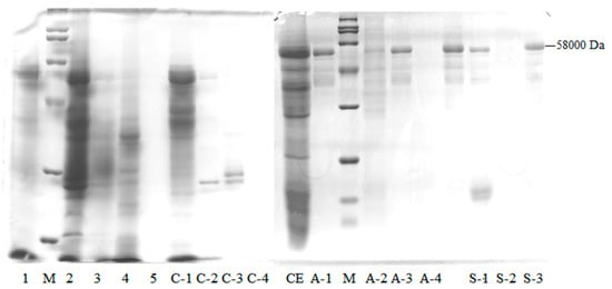 Figure 2. SDS-PAGE of the endo-1,4-β-xylanase. Lane CE represent crude enzyme; Lanes 1, 2, 3, 4, and 5 represent AS0-20, AS20-40, AS40-60, AS60-80, and AS80-100, respectively; Lanes C-1, 2, 3, 4 represent the four peaks eluted by SP-Sepharose Fast Flow cation chromatography, respectively; Lanes A-1, 2, 3, 4 represent the four peaks eluted by Q-Sepharose Fast Flow anion chromatography, respectively; Lanes S-1, 2, 3 represent the three peaks eluted by Source 30Q anion-exchange chromatography, respectively; M is the protein marker. Note: from top to bottom, the molecular weights of protein markers are 200, 116, 97.2, 66.4, 44.3, 29.0, 20.1, 14.3, and 6.5 kDa.
