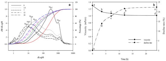 Figure 3. High-performance gel filtration chromatography and the change of viscosity of high-viscosity wheat-derived WEAX after the degradation by endo-1,4-β-xylanase. (a) Mw changes of WEAX. (b) viscosity changes of WEAX.