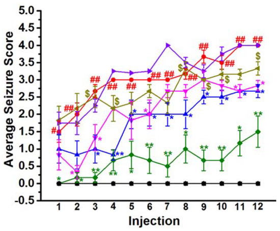 2.1. Effect of Chronic Administration of E177 on the Average Seizure Score of PTZ-Kindled Rats