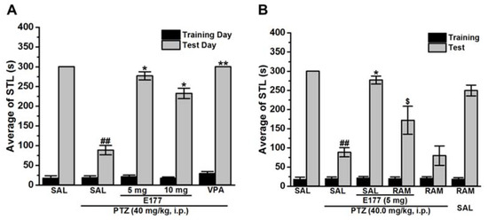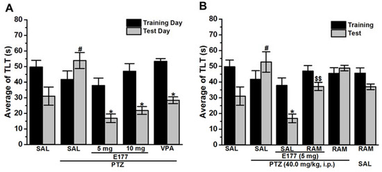 2.2. Effects of E177 on Mmemory Deficits in Inhibitory Avoidance Paradigm of PTZ-Kindled Rats