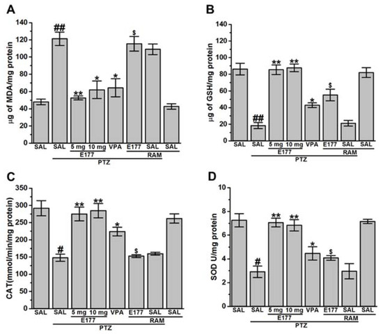 2.4. Effects of E177 Treatment on Oxidative Stress Level of PTZ-Kindled Rats