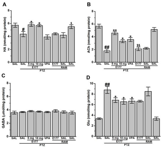 2.5. Effects of H3R Antagonist E177 Treatment on Altered levels of Histamine, Acetylcholine, GABA, and Gultamate in Hippocampal Tissues of PTZ-Kindled Rats