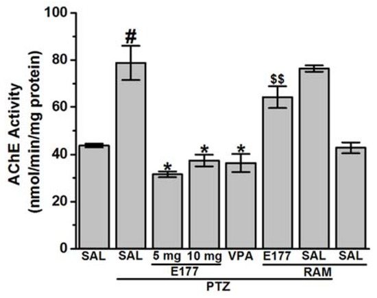 2.6. Effects of H3R Antagonist E177 Treatment on Elevated Acetylcholine Esterase Activity Levels in Hippocampus of PTZ-Kindled Rats