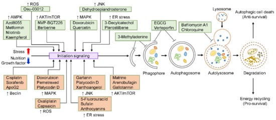 | Matrine | Alkaloid | Inhibits AKT/mTOR signaling | Inducer | Survival | [82,83] |