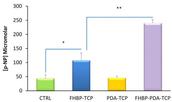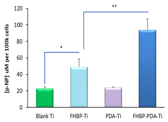 3.5. PDA-FHBP Hybrid Ti Coatings Support a Good Human Osteoblast Maturation Response