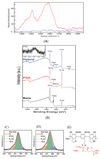The high-resolution N1s analysis provides insight on the possible linking mechanism between FHBP and PDA, which is assumed to be a Schiff-base reaction (Figure 3C-E). The N1s peaks were deconvoluted with three distinctive amine functional groups by referring to the previous report [29]: primary amine (R-NH2) at 401.9 eV, secondary amine (R2-NH) at 399.9 eV and tertiary amine (=N-R) at 398.8 eV. As a result, we could identify the primary amine groups (16%) in the PDA structure (Figure 3C), which should be originated from the un-indolised dopamine unit, as proposed by Liebscher et al. [30]. Considering the presence of the ketone group in FHBP, we expected that the Schiff-base reaction can contribute to the tethering of FHBP on the PDA. Regarding this, we confirmed that the PDA-FHBP (hybrid) Ti has a much higher tertiary amine (=N-R) functionality of 14 at. % (Figure 3D) compared to PDA-Ti, which was 8 at. % (Figure 3C). This should be due to the imine bonds (tertiary amine) formation via the Schiff-base reaction (Figure 3E), which strongly supports our assumption.