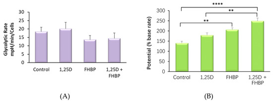 Cell differentiation is often accompanied by alterations in the cells’ metabolic profile [31]. In order to assess the effect of 1,25D and FHBP on MG63 cells, we assessed rates and potentials of the cells for glycolytic metabolism and oxidative phosphorylation using a Seahorse XFe24 metabolic analyser (Figure 5). Our results indicate that a three-day treatment with FHBP significantly increases the basal rate of oxidative phosphorylation (Figure 5C) but not the basal rate of glycolysis (Figure 5A). The FHBP/1,25D combination elicited no extra effect on basal oxidative metabolism over the effect of FHBP alone, and 1,25D by itself had no effect on either glycolytic or oxidative metabolism. Interestingly, treatment of the cells with 1,25D, FHBP or a combination elicited a stepwise increase of the total glycolytic capacity of the cells but had no effect on the oxidative capacity. These results indicate that MG63 maturation is accompanied by increased basal mitochondrial oxidative metabolism, which markedly increases the ability of these cells to increase glycolytic rates in response to demand.