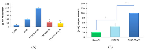 In a follow-on experiment, we explored the retention of FHBP to Ti following immersion of FHBP-Ti and PDA-FHBP-Ti in serum-free culture media for one week under cell-culturing conditions. On completion of the incubation time, the conditioned medium was recovered from each of the different Ti specimens, spiked with 1,25D and the resultant solutions applied to established lawns of MG63 cells. Cells were left for three days prior to performing a total ALP activity assay. Each of the different discs that had been immersed were subsequently seeded with MG63 cells, in the presence of 100nM 1,25D, and, also, left to culture for three days prior to performing the ALP assay. The overall outcome from these experiments indicated good stability of the FHBP coating, whether applied alone or in combination with a PDA film. As expected, the co-treatment of established lawns of MG63 cells with 1,25D and FHBP (positive control) stimulated a robust maturation response (Figure 6A) with the level of p-NP from p-NPP at 243 ± 9 μM compared to 99 ± 7 μM for cells treated with FHBP alone and 25 ± 5 μM for MG63s exposed to 1,25D alone. When MG63 cells were treated with 1,25D-spiked conditioned media from each of the different FHBP-functionalised Ti samples, the level of p-NP generated was approximately 50 ± 12 μM, a modest increase in MG63 ALP activity above 1,25D alone but noticeably and significantly less (p < 0.0001) than the maturation response incurred to FHBP alone. These data suggest that any FHBP losses from the Ti surfaces were of no significant concern. This was supported for the maturation of MG63 cells to recovered, functionalised Ti discs (Figure 6B). Indeed, the extent of MG63 maturation at both FHBP-Ti and FHBP-PDA-Ti following immersion in medium for one week were very similar to the maturation responses of cells to the same surface treatments without prior culture medium exposure (compare to Figure 4).