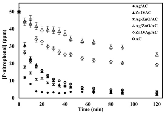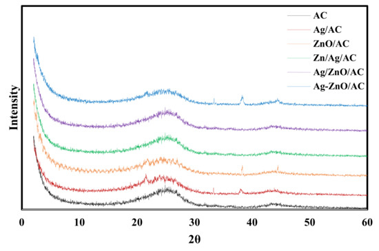 | Ag/AC | ZnO/AC | Ag/ZnO/AC | ZnO/Ag/AC | Ag-ZnO/AC | |||