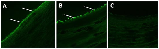 Representative confocal images arterial segments following keratose delivery. Confocal microscopy confirmed the presence of the keratose at (A) 1 h and (B) 3 days under peripheral deformation conditions. (C) Negative control depicts the lack of tissue autofluorescence during confocal imaging.