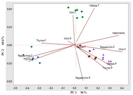 Principal component analysis (PCA) a) Phenolic compounds, flavonoids, tannins, by drying method and plant materials. [The different drying methods correspond to the Blue (Fresh plant), red (Microwave oven), green (Conventional) and violet (Freeze drying) icons] and [Acronyms per sample indicate P (Phenols), F (Flavonoids), and T (Tannins)] [Red line indicates the direction of the maximum variance of the data to orthogonal axes of each component].