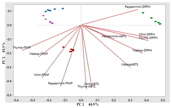 Principal component analysis (PCA) b) antioxidants capacity (ABTS, DPPH, FRAP), by drying method and plant material [the different drying methods correspond to the Blue (Fresh plant), red (Microwave oven), green (Conventional) and violet (Freeze drying) icons] [Red line indicates the direction of the maximum variance of the data to orthogonal axes of each component].