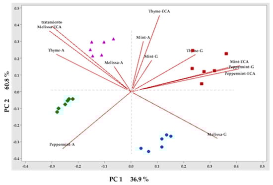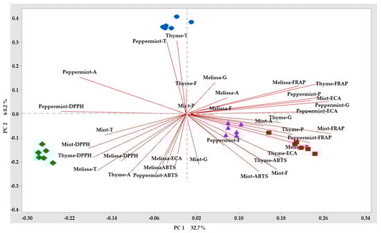 The analysis of the phytochemical compounds allowed us to identify the different compounds that were maintained after applying the drying method by plant material, the phytochemical compounds were the first analyzed by PCA, separating compounds by drying method. The analysis of the phenolic compounds is shown in (Figure 1). The two principal components (PC) described 78.8% of the variation among drying methods. PC1 describes 36% variation, whereas PC2 described 60.4%. Flavonoids in Melissa, peppermint, and mint, as well as the phenolic compounds in Melissa, peppermint and thyme described a positive variation in PC1 grouping in the drying methods with conventional drying method and freeze-drying. PC2 was described by Melissa and mint tannins grouped in conventional drying method. The drying methods that had of the greatest effect phenolic compounds were grouped into the microwave drying and freeze-drying methods. In the case of antioxidant capacity, the PCA showed that the first two principal components PC described 93.5% of the variation (Figure 2). In relation to antioxidant capacity, PC1 describes 44.9% of the variation, group the method by ABTS in the four plant materials studied, as well as the DPPH in Melissa, thyme, and mint. Whereas, PC2 describes 83.5% of the variation in the method by FRAP in the four plant materials. Grouping the three methods of quantification of antioxidant capacity in the microwave drying method. In the case of biological activity, the PCA showed that the first two principal compounds PC described 79.1% of the variation (Figure 3). Regarding the biological activity, PC1 describes 36.9% of the variation among treatments separating the enzymatic inhibition positively in Melissa by α-glucosidase and negatively in peppermint by α-amylase, PC2 described 60.8% of the variation in the biological activity grouping positively the biological activity in mint with the activity α-amylase, peppermint, thyme and mint with the activity α-glucosidase and ECA. The HCA (Hierarchical Cluster Analysis) groupings that grouped the greatest amount of biological activities were microwave drying method in a positive way and freeze-drying method in a negative way. On the other hand, in Figure 4, PCA was used to classify plant material according to their phytochemical composition affected by drying methods. HCA allowed the formation of clusters for the different drying methods, in order to compare their influence on phytochemical composition for the plant material. Variation for the 3 drying methods were explained in a 32.7% by the PC1. Whereas, PC2 allowed the explanation of 60.2% of the variation in composition for fresh plant material. PC1 separated drying methods in relation to the phytochemical compounds. However, it was not possible to see a clear separation, and the same occurred for PC2. Therefore, HCA appeared to be the most suitable tool in separating drying methods with respect to their influence on phytochemical composition for plant material. Therefore, as Figure 1, Figure 2, Figure 3 and Figure 4 show, there are large differences between the components in the case of fresh components and those after the different drying methods, which are hugely different in the technique used for this purpose.