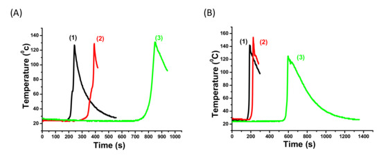 Optical pyrometric measurements (temperature vs. time after mixing; 4 mm thick sample) under air in resin 1 for Redox FRP for (A): (1) Cu(AAEMA)2/DPS (0.5/2 %wt), (2) Cu(AAEMA)2/DPS (1/1 %wt), (3) Cu(AAEMA)2/DPS (2/0.5 %wt) and (B): (1) Mn(acac)2/DPS (0.5/2 %wt), (2) Mn(acac)2/DPS (1/1 %wt), (3) Mn(acac)2/DPS (2/0.5 %wt) initiating systems.