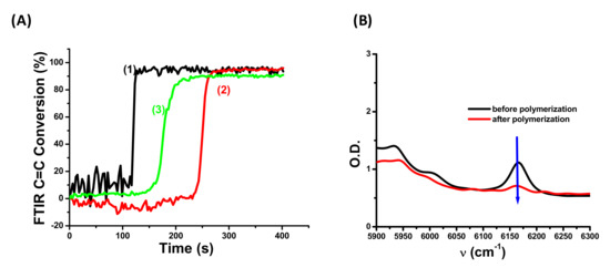 These polymerization processes were also followed by Real-Time FTIR spectroscopy. Remarkably, very high final methacrylate function conversions (e.g., FC = 98% - Figure 3A and Table 1) were found under air using the two-component Metal complex/DPS redox systems (1/1 wt %). The recorded FTIR spectra before and after polymerization which showed a full decrease of the characteristic C=C peak at 6160 cm−1 are depicted in Figure 3B.