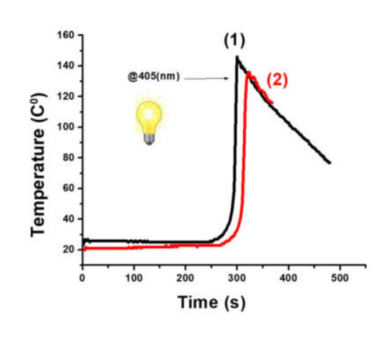 Optical pyrometric measurements (temperature vs. time after mixing; 4 mm thick sample) under air using a Redox Initiating System (RI)S Mn(acac)2/DPS (1/1 wt%); (1) with light (LED at 405 nm) and (2) without light.