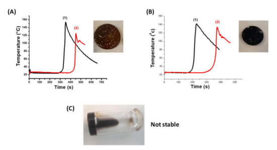 Optical pyrometric measurements (temperature vs. time after mixing, 4 mm thick sample) under air in resin 1 for Redox FRP of (A) (1) Mn(acac)2/DPS (1/1 wt%) fresh formulations and (2) Mn(acac)2/DPS (1/1 wt%) after 6 days of storage at 50 °C; (B) (1) Cu(AAEMA)2/DPS (1/1 wt%) fresh formulations and (2) Cu(AAEMA)2/DPS (1/1 wt%) after 6 days of storage at 50 °C; (C) Mn(acac)3 (1 wt%) after 48h of storage in resin 1 at 50 °C.