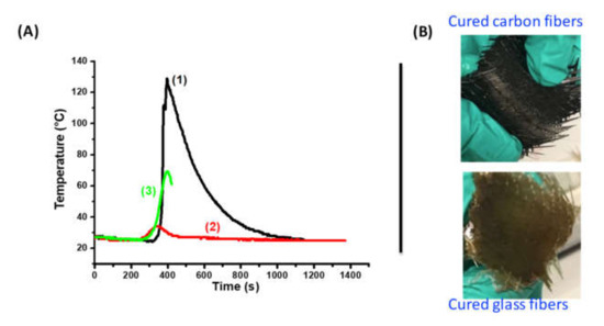 (A) Optical pyrometric measurements for the curing of prepregs (glass fibers or carbon fibers/Resin 1 composites) in the presence of (1) Mn(acac)2/DPS (1/1 %wt) (without fibers), (2) Mn(acac)2/DPS (1/1 %wt) (carbon fibers), (3) Mn(acac)2/DPS (1/1 %wt) (glass fibers) and (B) Photos for impregnated glass fibers taken after mixing with redox initiating system for 50% glass or carbon fibers and 50% of organic resin.