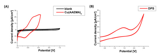 Cyclic voltammetry (potential vs. saturated calomel electrode (SCE)) experiments in acetonitrile (ACN) (containing 0.2 M tetrabutylammonium hexafluorophosphate, 0.1 V/s) for the determination of (A) reduction potential of Cu(AAEMA)2 and (B) oxidation potential of DPS.