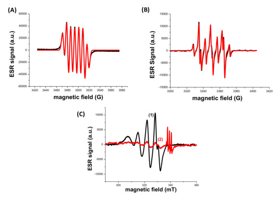 Electron Spin Resonance (ESR)-spin trapping experiment using [PBN] = 10−2 M (as spin trap agent); for the mixing of [DPS] = 10−1 M with (A) Mn(acac)2, (B) Cu(AAEMA)2 simulated (red) and experimental (black) spectra, (C) Reduction of Cu (AAEMA)2; (1) without DPS and (2) with DPS in tert-butylbenzene; under N2.