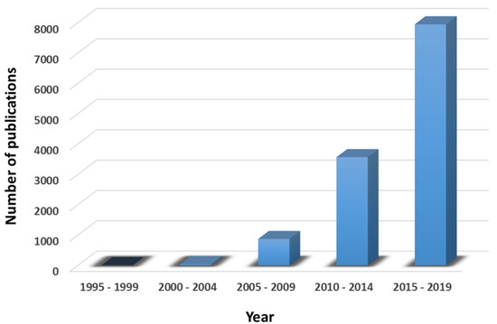 Number of peer-reviewed publications in the field of nanomedicine in Web of Science divided in periods of 5 years.