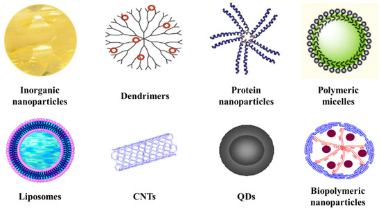 In the past few decades, nanostructures with various shapes and sizes have been created and applied to encapsulate many drugs: inorganic nanoparticles, dendrimers, protein nanoparticles, polymeric micelles, liposomes, CNTs, QDs and biopolymeric nanoparticles (Figure 2). Table 1 summarizes the advantages and drawbacks of these nanoparticles. All these nanostructures, their properties and some examples of their applications related to cancer diseases are illustrated and discussed below [18].