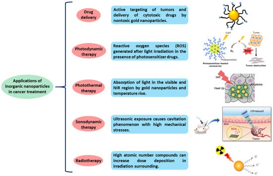 Inorganic nanoparticles include gold [21], silver [22], iron oxide [23] and silica nanoparticles [24]. In recent years, the interest of using inorganic nanoparticles has been growing in different medical applications, such as bioimaging, biosensors, target/sustained drug delivery and photoablation therapy due to their particular properties like surface plasmon resonance (SPR). The SPR phenomenon enables inorganic particles to convert light into heat and scatter the produced heat to destroy the cancer cells by irradiating previously the nanoparticles [25]. Furthermore, the surface functionalization of inorganic nanoparticles provides them with a good biocompatibility and versatility, making these systems more promising for their use in biomedical applications [26]. Some of the applications in which inorganic nanoparticles are used for cancer treatment are summarized in Figure 3.