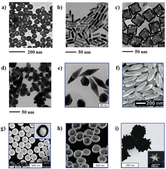 TEM images of different types of gold nanoparticles: (a) gold nanospheres; reprinted with permission from [30]; copyright (2005) American Chemical Society; (b) gold nanorods; reprinted with permission from [31]; copyright (2013) American Chemical Society; (c) gold nanocages; reprinted with permission from [31]; (d) gold nanohexapods; reprinted with permission from [31]; (e) gold bipyramids; reprinted with permission from [32]; copyright (2005) American Chemical Society; (f) “nanorice” (gold-coated Fe2O3 nanorods); reprinted with permission from [33]; copyright (2006) American Chemical Society; (g) SiO2/Au nanoshells (the inset shows a hollow nanoshell); reprinted with permission from [29]; copyright (2010) Elsevier; (h) nanobowls with bottom cores; reprinted with permission from [34]; copyright (2009) American Chemical Society; (i) spiky SiO2/Au nanoshells (reprinted with permission from [35]; copyright (2010) American Chemical Society; the inset shows a gold nanostar); reprinted with permission from [36]; copyright (2006) American Chemical Society.