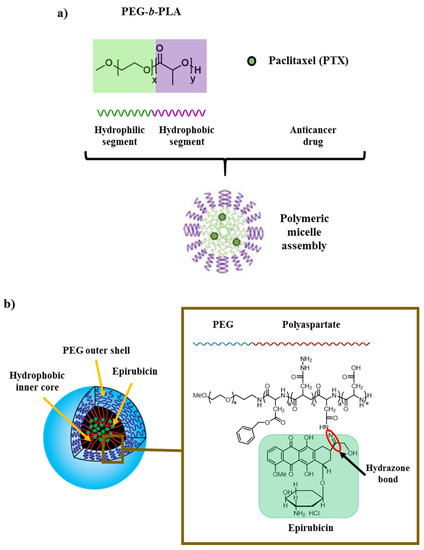 Anticancer agents can be loaded physically or chemically in the core region of the polymeric micelles. The encapsulation in a polymeric micelle of paclitaxel (PTX), a drug used for the treatment of different kinds of cancer (ovarian cancer, breast cancer, lung cancer, cervical cancer, pancreatic cancer and Kaposi sarcoma), is illustrated in Figure 10a [61]. PEG-b-PLA micelles are widely used to increase the poor solubility of different drugs like PTX. In this case, micelles were loaded physically with the anticancer drug.