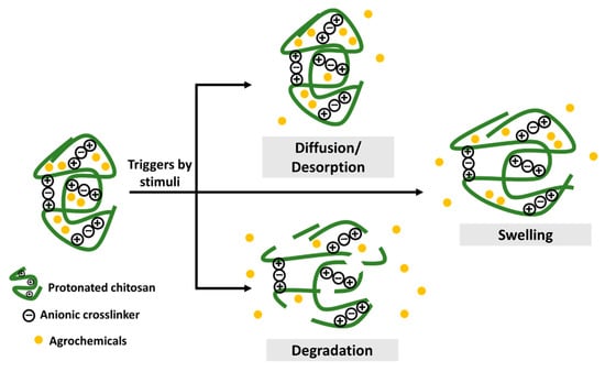 The release mechanism upon stimulus-response is through pore diffusion, surface desorption, capsule swelling and degradation, as illustrated in Figure 1 [7,25]. The diffusion-controlled mechanism relies on a diffusion rate gradient while the surface desorption refers to the active ingredient adsorbed on the surface of the nanoformulation. Upon hydration, the release of agrochemicals depends on the swelling of the chitosan capsule. Moreover, enzymatic reactions or other environmental factors might result in the rupture or degradation of the capsule matrix. Hence, the controlled release based on the stimuli response in nanoformulations enables the release of the agrochemicals effectively and efficiently at the target site of interest. A pH-dependent release of Cu was observed upon its encapsulation into chitosan nanoparticles, in which the decrease from pH 3 to pH 1 leads to the increased release of Cu from 21.5% to 44.1%, respectively [26]. This is due to the protonation of the chitosan’s amino group. At higher pH of 6 and 7, a drastic decrease of Cu release was observed (6.1% and 4.9%, respectively), due to the deprotonation of the chitosan’s amino group. Moreover, the sustained release of Cu for up to 96 h was obtained at pH 4.5. A stimulus-response release mechanism was observed for chitosan-Zn nanoparticles, in which the Zn release was mainly due to the stomatal uptake, followed by diffusion and swelling of polymers upon water penetration [27]. The slightly acidic environment of the intracellular medium is also reported to be able to help release Zn from chitosan nanoparticles. Chitosan-hexaconazole nanoparticles and chitosan-dazomet nanoparticles demonstrated diffusion-controlled release of the fungicides at pH 5.5 with half release times (t1/2) of 42 and 11 h, respectively [28,29]. Moreover, the co-release of hexaconazole and dazomet from the chitosan-hexaconazole-dazomet nanoparticles prolonged the release time with t1/2 of 53 and 15 h, respectively [30]. The diffusion-controlled release of methomyl at pH 6.0 with t1/2 of 36–70 h has been obtained by its encapsulation into carboxymethyl chitosan and azidobenzaldehyde [31]. The release of the insecticide acetamiprid from nanocapsules of chitosan-alginate was reported to be pH-dependent, in which half of the acetamiprid was released after 36 h at pH 7.0 and 4.0 compared to only 24 h needed to release the same amount at pH 10 [32].