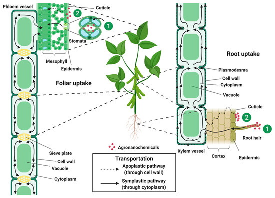 There are two possible pathways of the movement of agronanochemicals from soil to root tissues: (1) root diffusion and (2) cuticular pathway. Root diffusion relies on the concentration gradient between the root and soil, which allows the movement from high to low concentrations parts. The uptake of agronanochemicals occurs through the cell wall barrier where the pore diameter of the plant cell wall measured using various techniques has been reported to be generally in the range of 5–50 nm [36,102,103]. However, some other works have also reported the possibility of pore enlargement upon interaction with the agronanochemicals, which in turn increases their uptake [96,103].