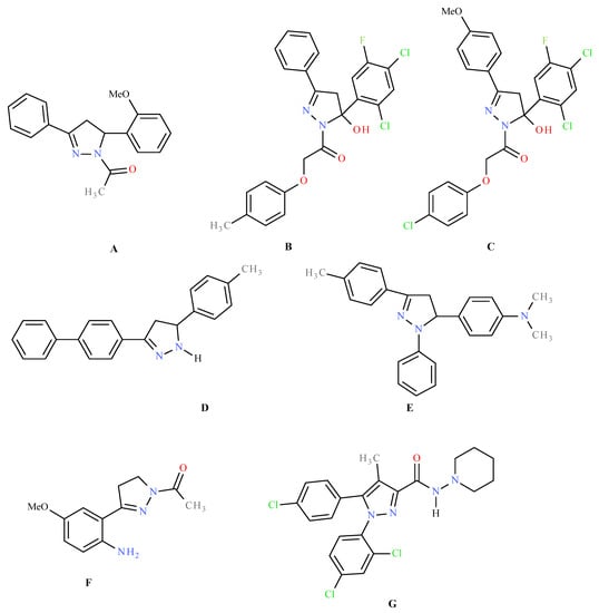 Examples of pyrazoline analogs with biological activity: (A)–anticancer, (B)–antibacterial, (C)–antifungal, (D)–anti-inflammatory, (E)–antidepressant, (F)—nitric oxide synthase (NOS) inhibitor and (G)—cannabinoid CB1 receptor antagonist.