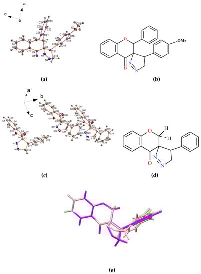 The molecular structure of compounds 2 and 8 is shown in Figure 2. Molecules of 2 and 8 crystalize in a monoclinic system in P21/n; however, in 8, an asymmetric unit has three molecules. The main chroman skeleton in 2 consists of a benzene and a pyran ring with a phenyl substituent at the C2 atom. In addition, 4-(4-methoxyphenyl)-4,5-dihydro-3H-pyrazole is attached at the C3 position.
