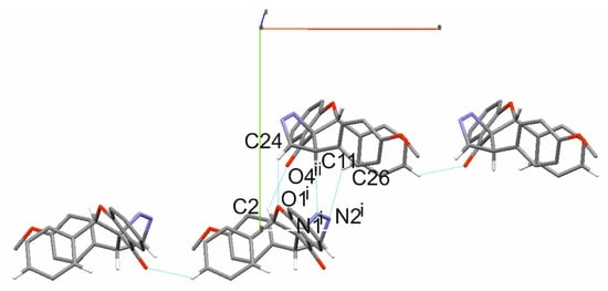 The crystal packing of 2 and 8 is enhanced by a network of hydrogen bonds (Figure 2). The molecules of compound 2 are linked by four intermolecular hydrogen bonds: C12-H12A…O1 (1/2−x, 1/2 + y, 1/2 − z), C2-H2…O4 (1/2 − x,−1/2 + y,1/2 − z), C26-H26…N2 (1/2 − x, 1/2 + y, 1/2 − z), C11-H11…N1 (1/2 − x, 1/2 + y, 1/2 − z), which are responsible for the formation of dimers (Figure 3).