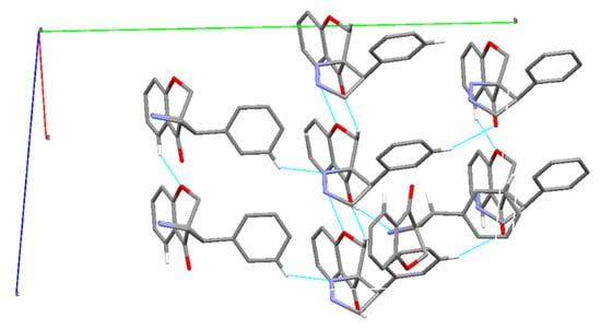 Additionally, each molecule is linked by a C24-H24…O4 (1 + x, y, z) hydrogen bond forming chains propagating along a axis. The intermolecular hydrogen bonds in crystal structure 8 produce a 3-D net of hydrogen bonds (Figure 4). The geometric parameters for the hydrogen bonds are presented in Table 2. Additionally, it is worth mentioning that compound 2 has higher values for all tested cytotoxic activities compared to 8 (Table 3); this is associated with its more extended spatial structure, in which a bulky phenyl substituent is attached in the C2 position. A similar trend is observed for benzylideneflavanone and benzylidenechromanone analogues []. However, taking into account the structure 2 and 10, which are similar and differ only the position of methoxy group in phenyl fragment cytotoxic activity is different. Therefore it could be concluded that in case of COLO-205 the position of OCH3 group influences on the activity (higher when m-OCH3 group is attached). This trend is also visible if we compare 2, 4 and 10 structures, for p-OCH3 substituent cytotoxic activity (COLO-205) is lower that for m-OCH3 substituent.