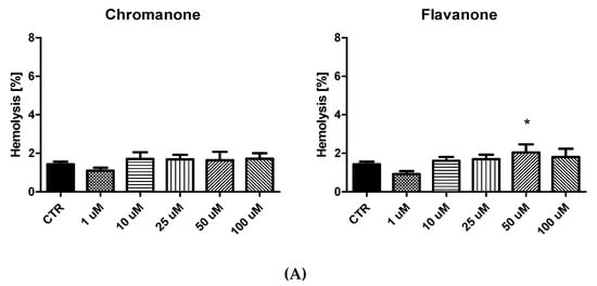 All synthesized compounds with potential biological activity have to be tested for blood compatibility since xenobiotics will react with blood cells upon administration. In this case, biocompatibility refers to the quantification of cellular and plasma components of the blood. The measurement of the integrity of RBC membrane is considered a simple and reliable method for estimating hemocompatibility [,]. The effects of the synthesized compounds, together with those of the two reference compounds flavanone and chromanone, on RBC hemolysis are depicted in Figure 6A,B. Neither flavanone nor chromanone was found to have any unfavourable effect on the erythrocyte membrane over the whole concentration range. A statistically significant increase in the rate of haemolysis was observed for most of the tested compounds at the higher concentrations. For instance, compounds 3 and 4 contributed to a significant disintegration of the erythrocyte membrane at concentrations above 25 µM, manifested by a higher percentage of hemolysis in comparison to control. However, these values did not exceed 5%, which means that there is not a risk of pathological hemolysis in in vivo conditions. Similar results were obtained for compounds 5, 6, 9, and 10.