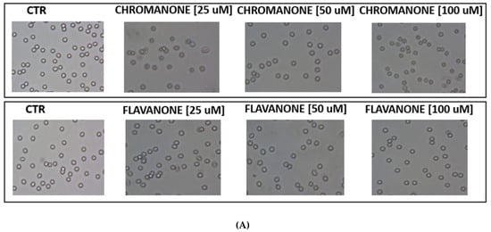 Microscope images of erythrocytes treated with (A)—reference compounds, chromanone and flavanone; (B)—compounds 1, 2, 3, 4, 5, 6, 7, 8, 9, 10. 2% erythrocyte suspension was treated at 37 °C for 60 min with indicated concentrations of compound. Representative phase-contrast images are shown (magnification of 400 times).